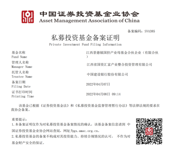 2022年4月7日,由景德镇国控金融发展有限公司与江西省国控、昌江区国资合作发起组建的江西景德镇国控产业母基金合伙企业(以下简称“母基金”)在中国证券投资基金业协会成功备案,标志着母基金正式进入投资运作阶段。