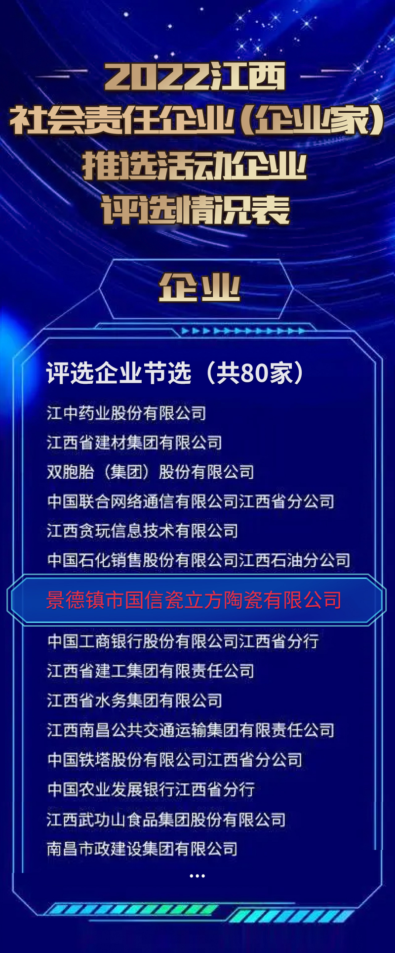 6月2日,由江西日报社(江西报业传媒集团)、省农业农村厅、省国有资产监督管理委员会、省地方金融监督管理局共同主办的“义利天下·2022江西社会责任企业(企业家)”推选活动正式揭晓,景德镇市国控集团旗下国信瓷立方陶瓷有限公司从全省480家企业中脱颖而出,成为景德镇市唯一入选企业。