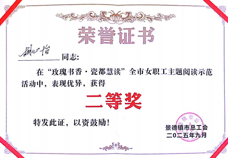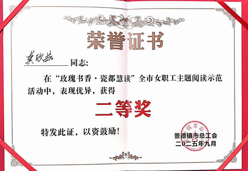 9月19日下午,在景德镇市总工会举办的“玫瑰书香 瓷都慧读”全市女职工示范阅读活动中,陶博城公司女职工胡心怡、龚欣茹代表国控集团参赛,凭借情景朗诵作品《瓷间玫瑰,书香漫卷》脱颖而出,以 97.70分的优异成绩(位列第二),荣获本次活动二等奖!